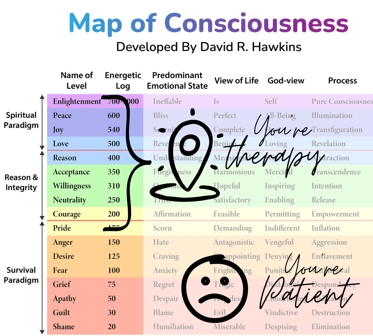 Disclaimer: The Map of Consciousness is presented here as an interpretive framework and model for understanding perspectives, as utilized within our service. It is not intended as a clinical diagnostic tool, and individual levels of consciousness are understood to be dynamic. Our process integrates this model with the specific insights and expertise provided by you, the therapist.